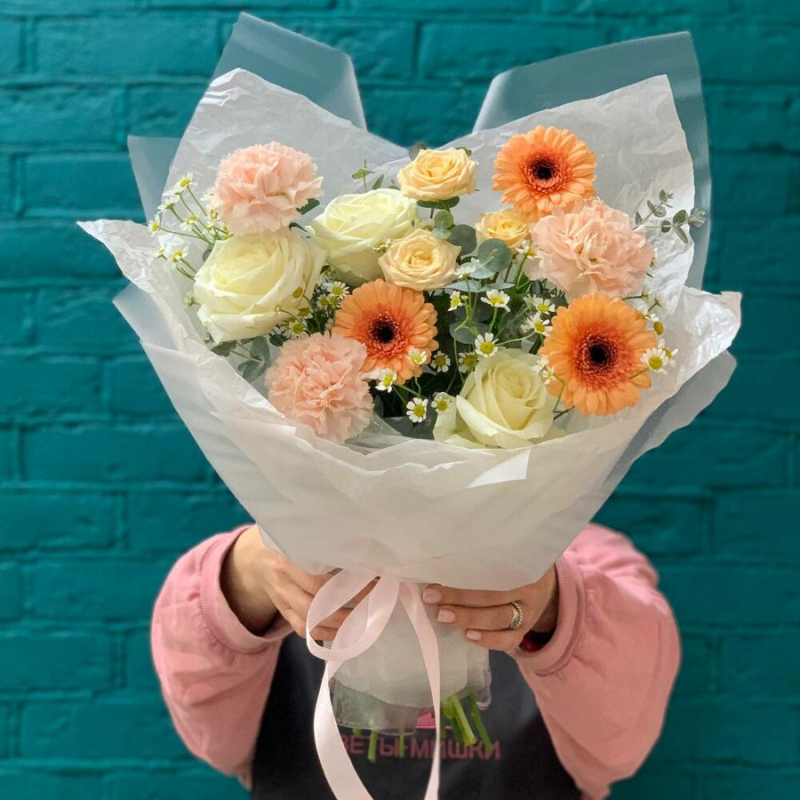 На фото букет «абрикосовый рассвет». В составе: роза 3 шт, кустовая роза 1 шт, гвоздика 3 шт, танацетум 3 шт, гербера 3 шт, писташ 2 шт, дизайнерская упаковка 1 шт, атласная лента 1 шт, . Все цветы свежие и ароматные, букет красиво оформлен и отлично подходит для подарка. Доступна доставка цветов или самовывоз.